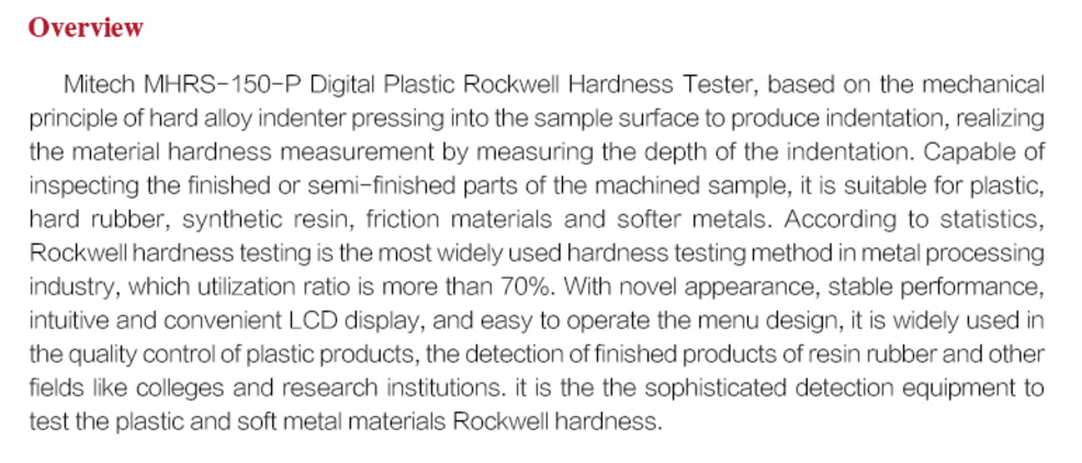 Measuring range | HRA:20-88,HRB:20-100,HRC:20-70,HRD:40-77, HRE:70-100,HRF:60-100,HRG:30-94,HRH:80-100, HRK:40-100,HRL:50-115,HRM:50-115,HRR:50-115 |